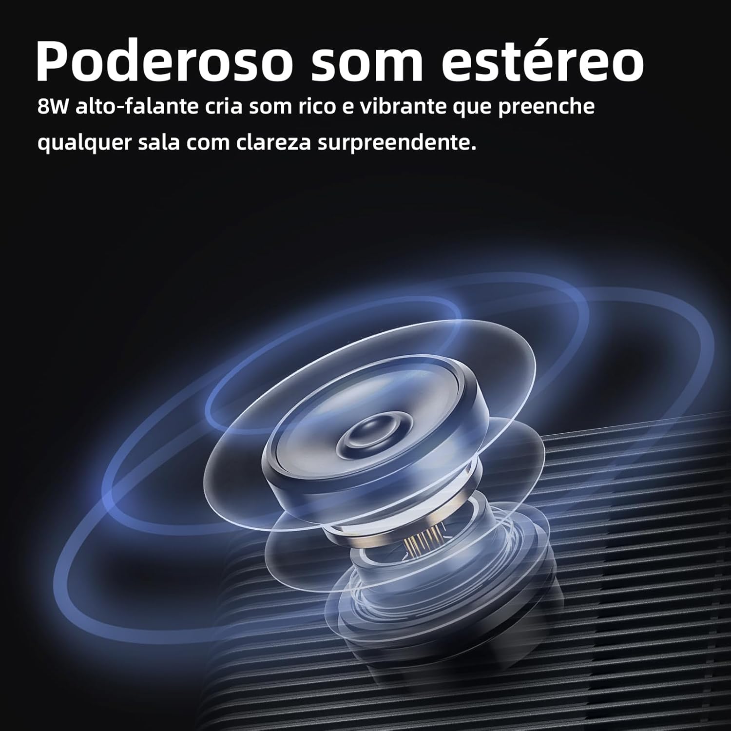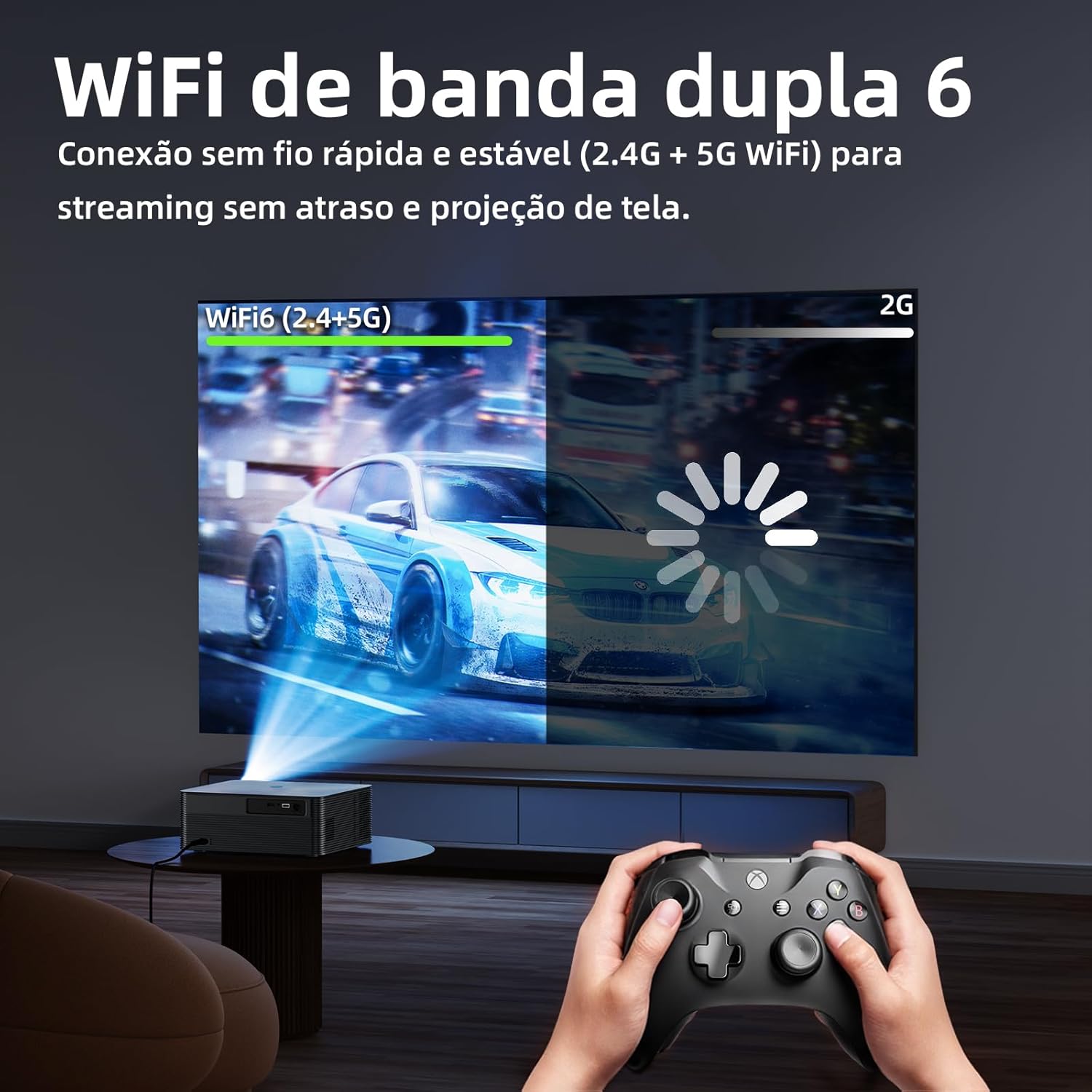 Tecnologia WiFi 6 usada e alto-falantes HiFi integrados de 10W:Utilizamos a mais recente tecnologia WiFi 5G+2.4G neste projetor android Bluetooth, com uma velocidade de transmissão pelo menos 30% mais rápida do que outros retroprojetor portátil 4k. Dois grandes altifalantes de 8W emitem sons potentes e envolventese permitem a ligacäo a v¡rios dispositivos de áudio, proporcionandouma experiència de audicäo maravilhosa.