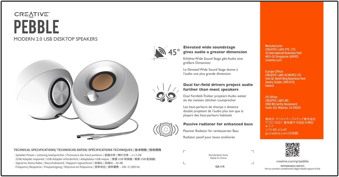 Com seus radiadores passivos integrados e um impressionante RMS combinado de 4,4 W, o pequeno Creative Pebble é capaz de fornecer áudio equilibrado com profundidade, imersividade e detalhes cristalinos. Basta ligar o seu dispositivo através da entrada de 3,5 mm e preparar-se para ser surpreendido.
