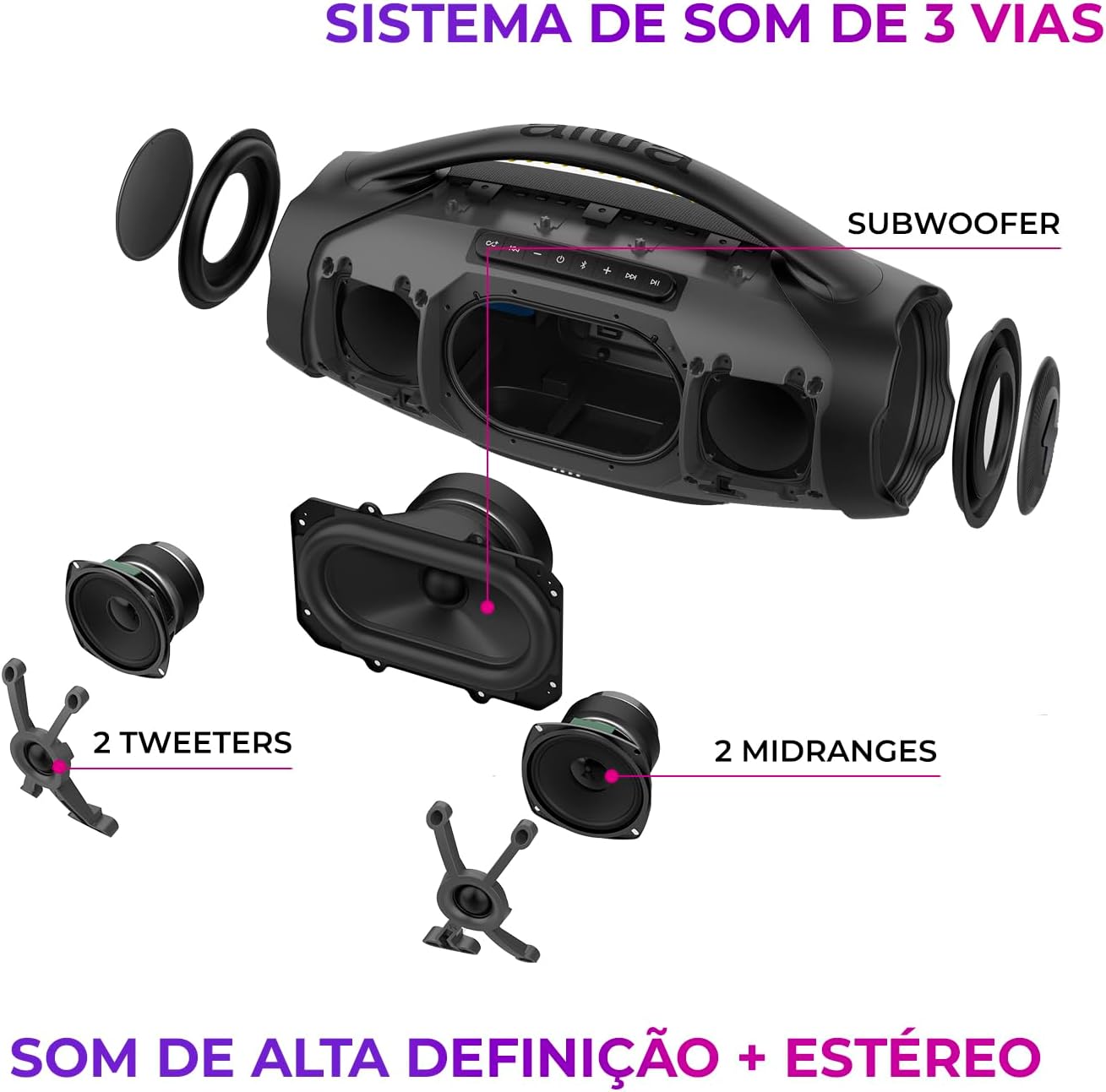 SOM DE ALTA DEFINIÇÃO COM 3 VIAS: Projetado com o sistema de som de 3 vias, a Boombox Light Plus AWS-BBS-01-LBL possui 1 subwoofer, 2 midranges e 2 tweeters, além de 3 amplificadores de áudio um para cada canal (grave, médio e agudo);