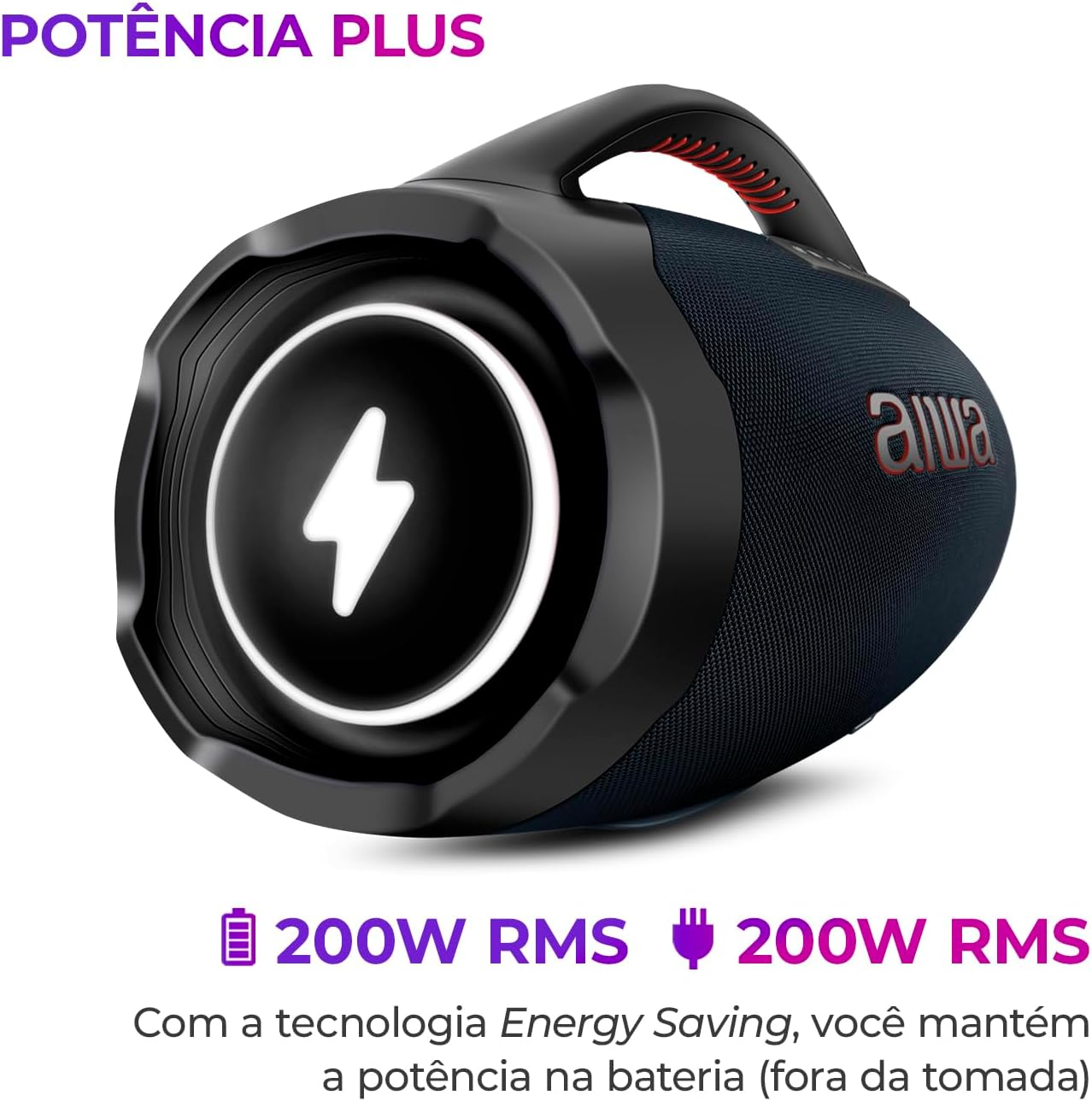 200W RMS DE POTÊNCIA Sinta a experiência sonora impactante com os 200W RMS de potência da caixa portátil AIWA. Você será levado pela música com graves mais profundos e som potente. E, com a tecnologia Energy Saving, você mantém os 200W de potência até ouvindo música na bateria (fora da tomada).
