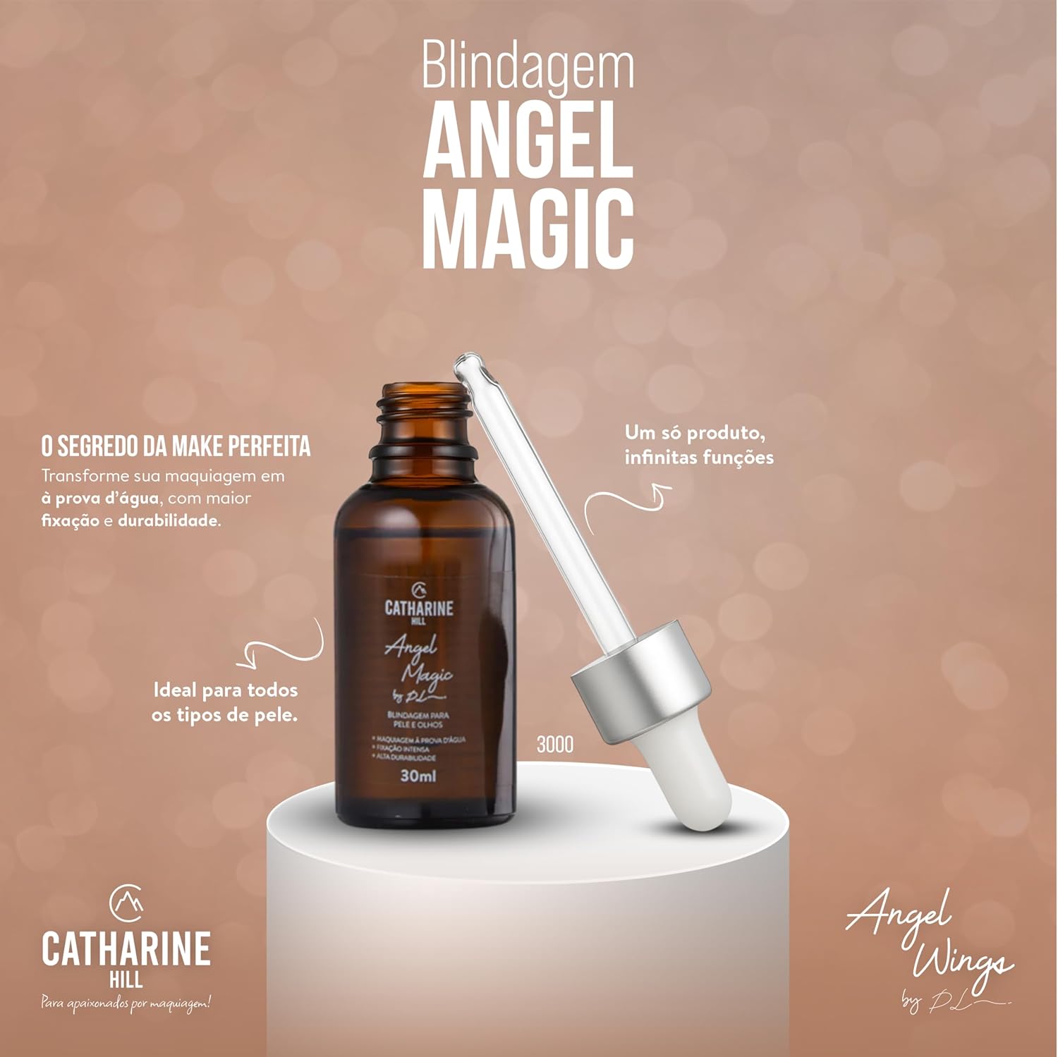 Abram o tapete vermelho, porque o glamour vai passar! É com muito orgulho que anunciamos o Angel Magic – A blindagem da Catharine Hill em parceria com a Pri Lessa. Esse produto veio para revolucionar a resistência das suas makes, e foi desenvolvido totalmente no Brasil por nossa equipe de especialistas e pela Pri. Juntos, encontramos a fórmula ideal para proporcionar praticidade e durabilidade em qualquer categoria de pele, maquiagem e temperatura. Com o uso do produto, sua make torna-se imediatamente à prova-d’água. O Angel Magic ainda pode ser utilizado para diluir e recuperar produtos ressecados. Bom demais, né?