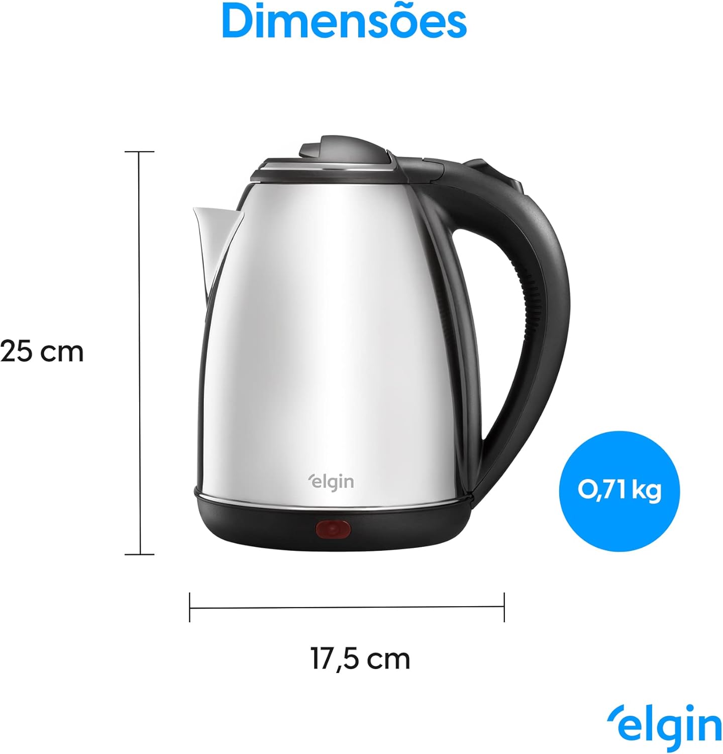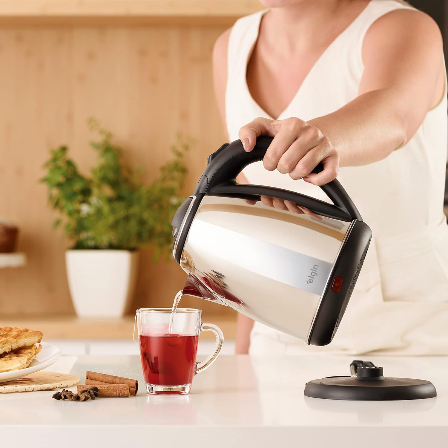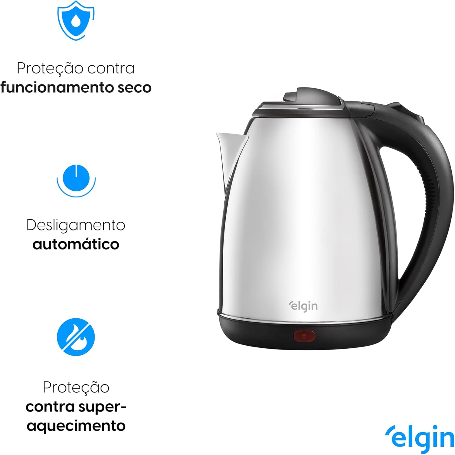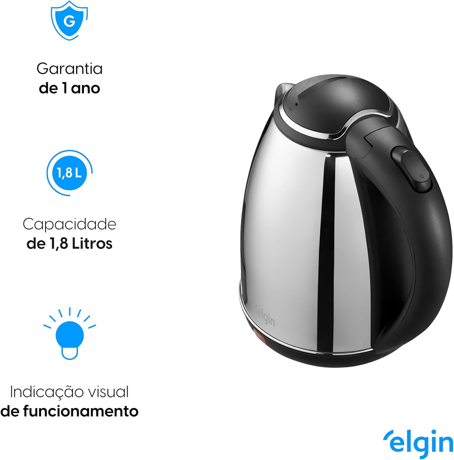A chaleira Elétrica Elgin possui design moderno com acabamento em inox, o que facilita a limpeza e garante maior durabilidade, capacidade de até 2 litros para o preparo de chás, cafés e até sopas, legumes e outros alimentos, tem indicação visual de funcionamento e para aumentar sua segurança, possui proteção antifuncionamento sem água e sistema de desligamento automático para quando a água atinge a temperatura ideal, além de Indicador luminoso de funcionamento. A jarra sem fio que garante muito mais praticidade para transportar e levar sua chaleira para qualquer lugar. Para maior rapidez na preparação da sua bebida preferida, a Chaleira Elétrica Elgin é o modelo ideal. A Elgin oferece garantia expressa de 1 ano para você usar sua chaleira sem preocupação.