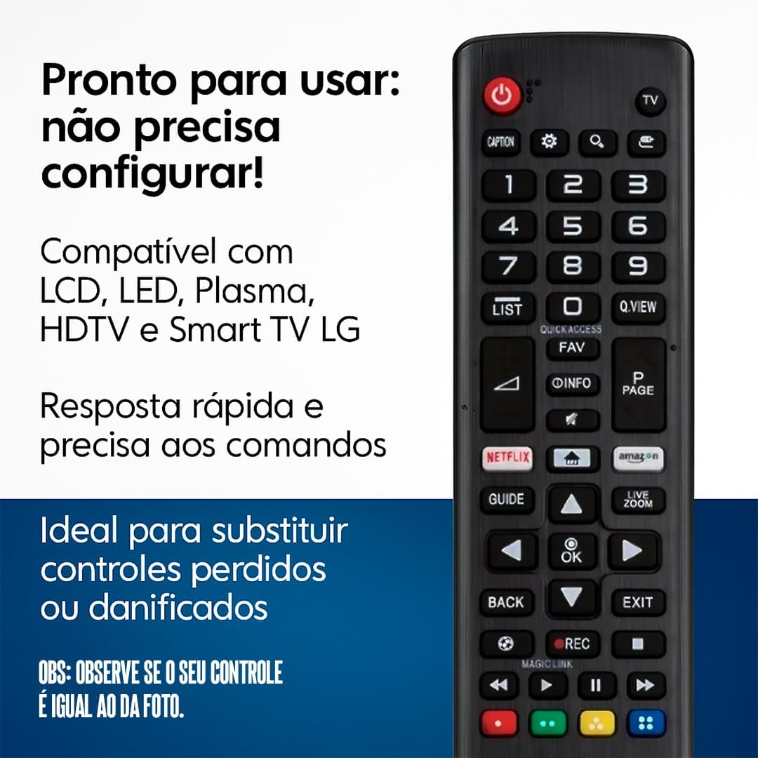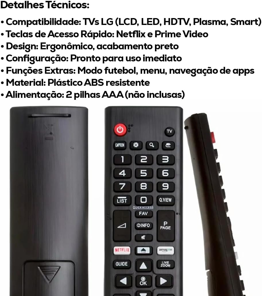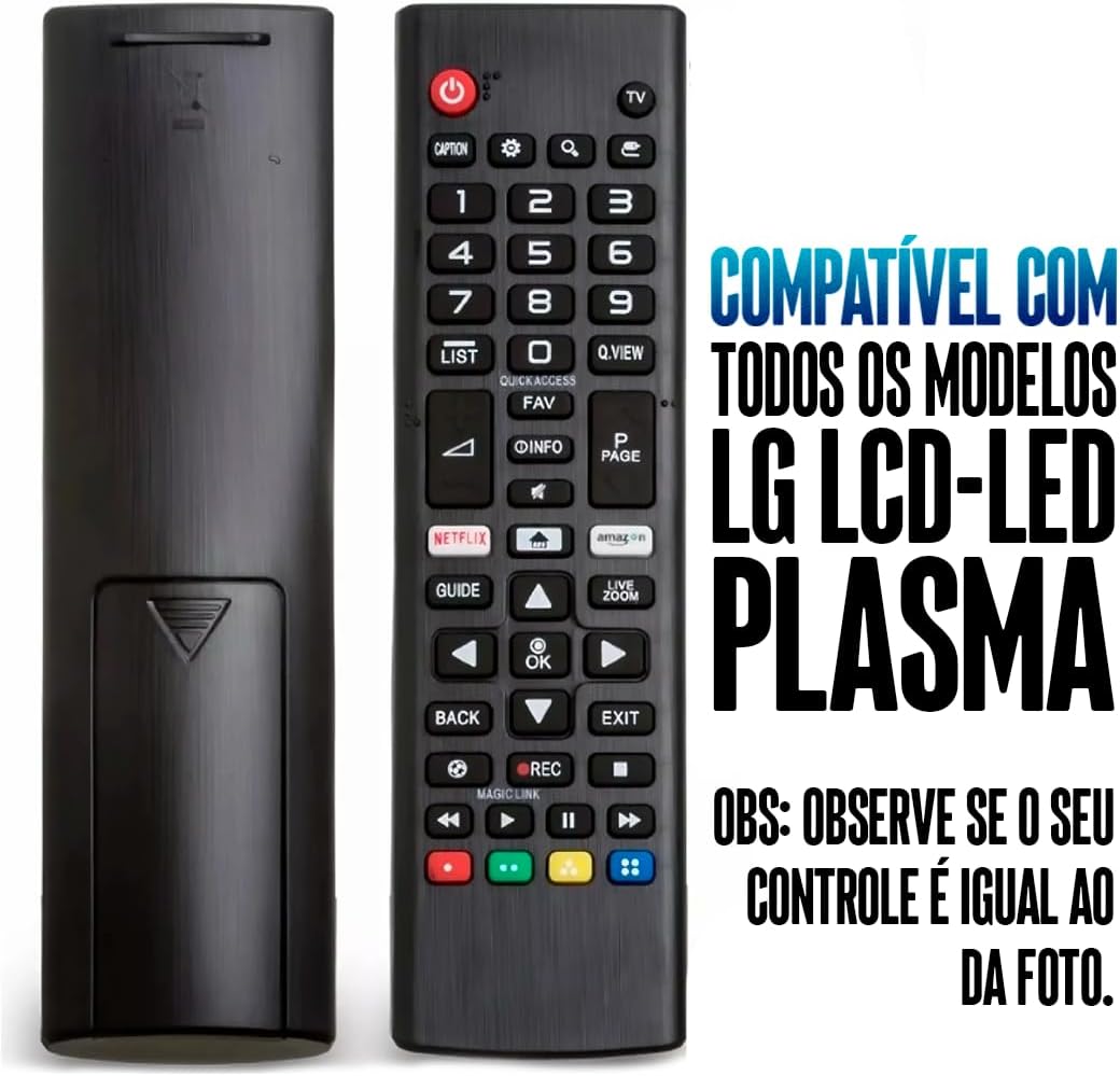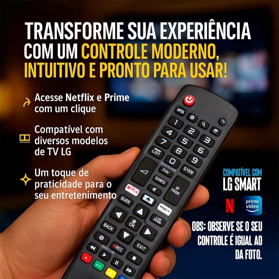 Este controle remoto é a solução perfeita para quem deseja praticidade e compatibilidade com diversos modelos de TV LeG, incluindo versões LCD, LED, Plasma, HDTV e Smart. Com ele, você acessa suas plataformas favoritas como Netflix e Prime Video com apenas um clique!