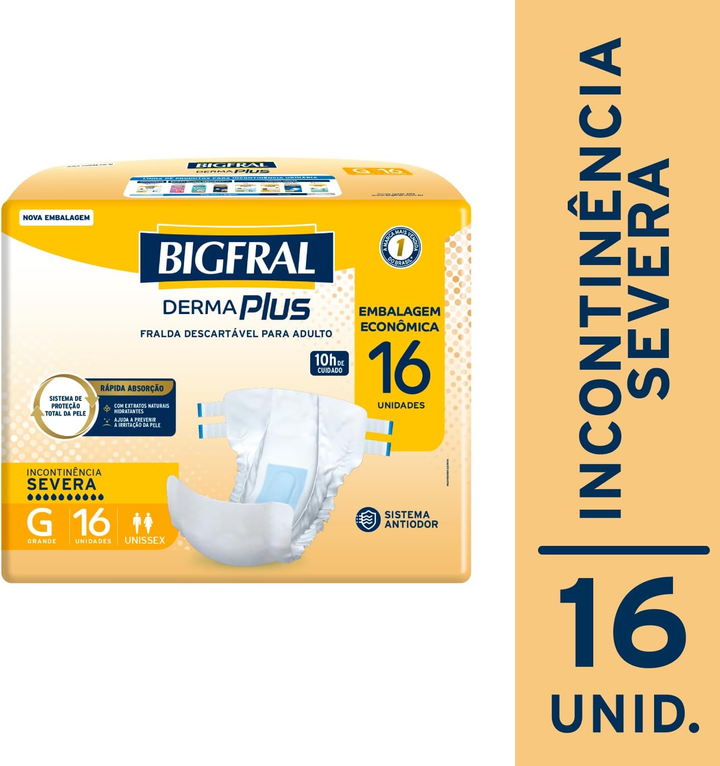 A Bigfral DermaPlus foi desenvolvida para adultos com incontinência urinária severa. Possui o exclusivo sistema de proteção total da pele, com extratos naturais hidratantes que ajudam a prevenir irritações, mantendo a pele protegida e saudável, além de sistema antiodor, trazendo até 10h de proteção e cuidado.