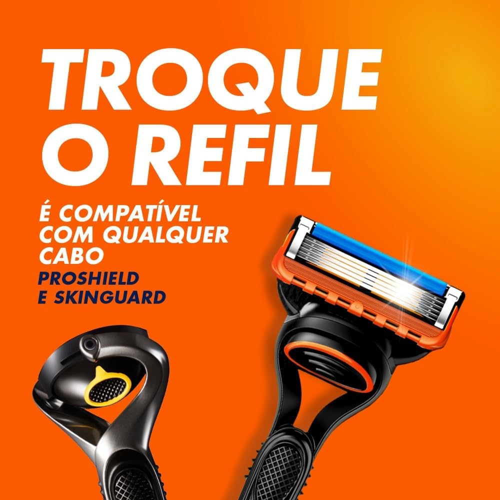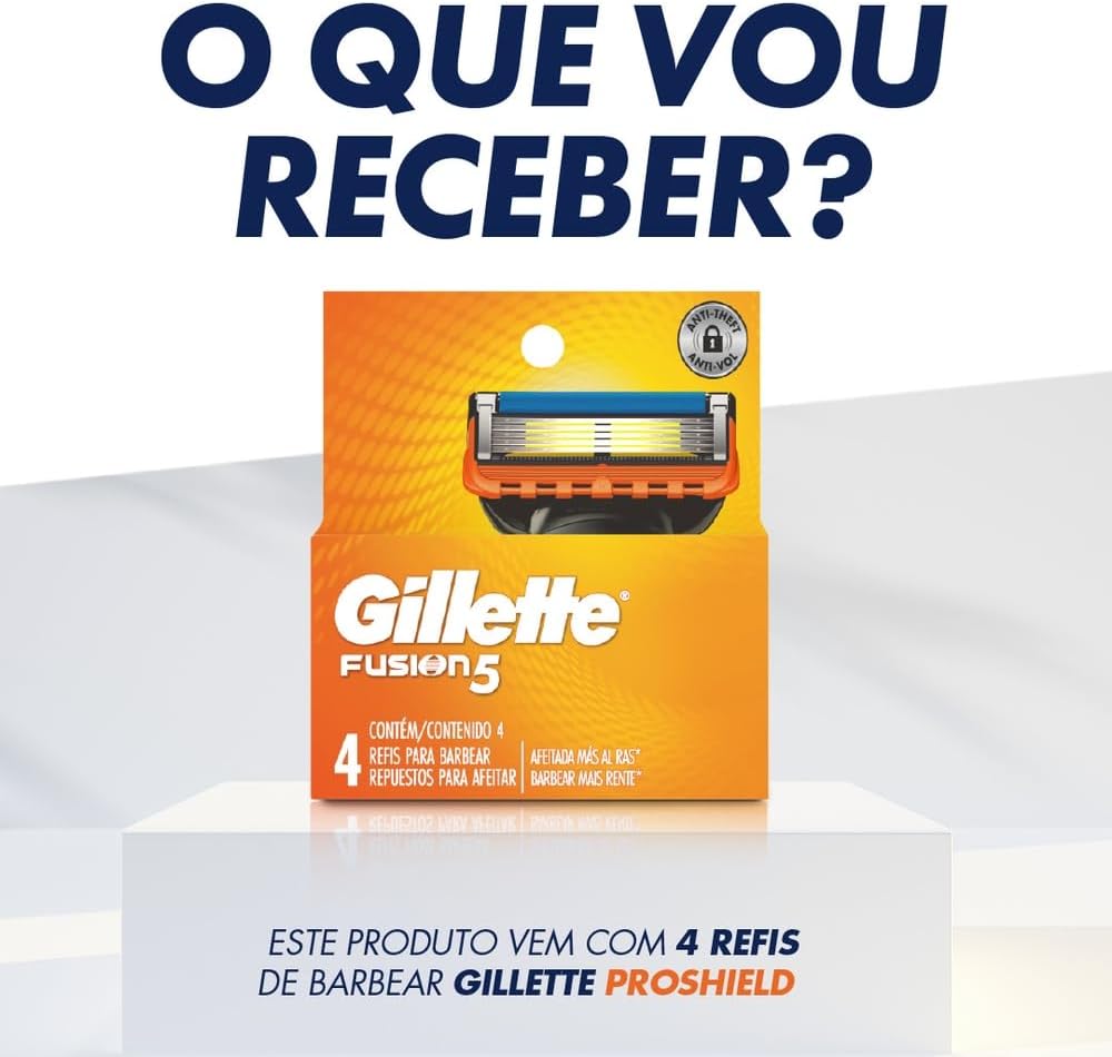 Refis para a máquina de barbear recarregável Gillette Fusion5, possui 5 lâminas anti-fricção, para um barbear mais rente* (* vs. Mach3). Foi desenhado para proporcionar um barbear suave, graças à sua fita lubrificante com indicador que muda de cor quando o barbear deixa de ser ideal; e microtensores que esticam suavemente a pele. Para locais de difícil acesso ao barbear e modelar os pelos faciais, o Fusion5 possui uma lâmina de precisão da cabeça para ajudá-lo a obter um barbear ideal. Todos os cartuchos Fusion5 podem ser usadas com qualquer cabo Fusion 5, Proshield e SkinGuard.
