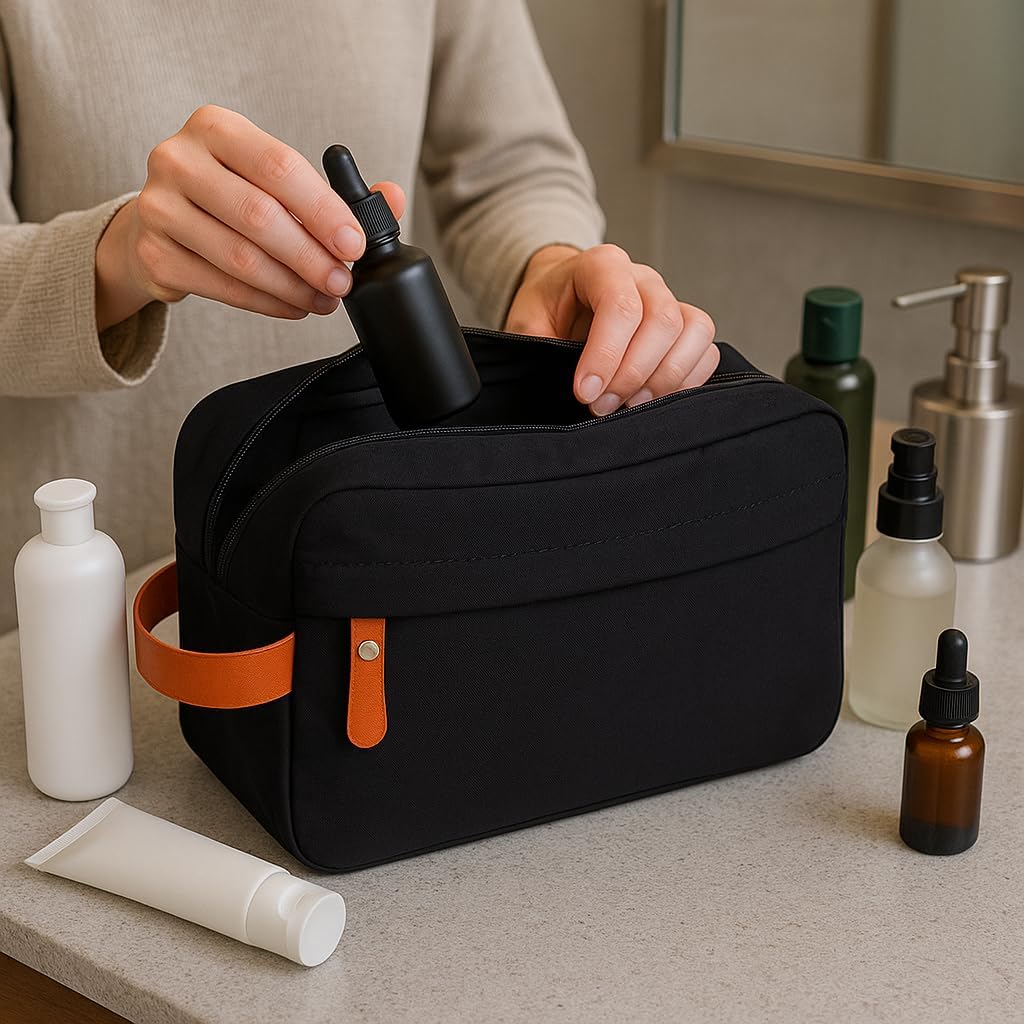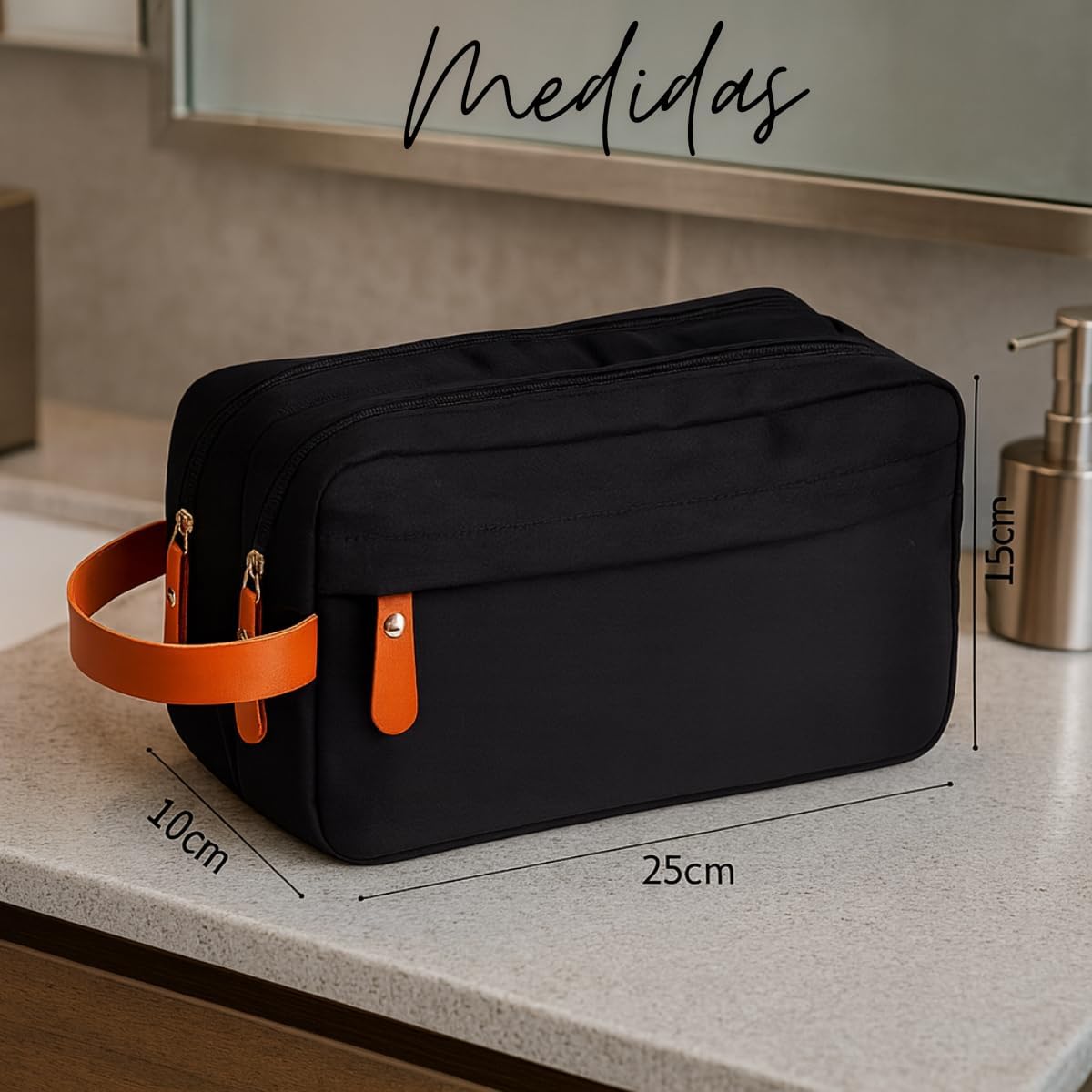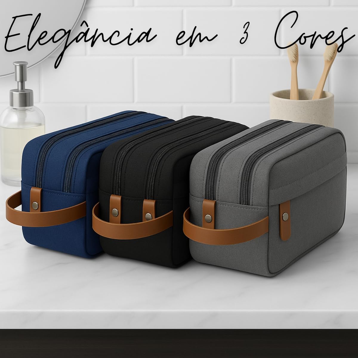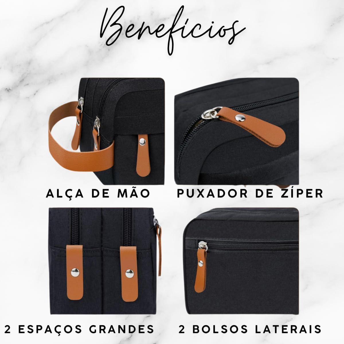 📦 Amplo espaço interno – dois compartimentos principais com zíper para organizar produtos de higiene, cosméticos e acessórios.