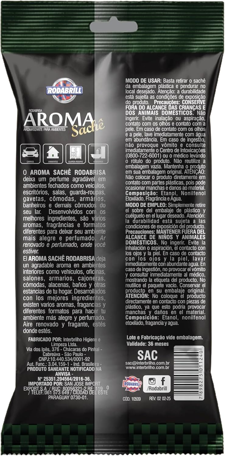 O AROMA SACHÊ RODABRISA deixa um perfume agradável em ambientes fechados como veículos, escritórios, salas, guarda-roupas, gavetas, cômodas, armários, banheiros e demais cômodos do seu lar. MODO DE USO: Basta retirar o sachê da embalagem plástica e pendurar no local desejado. Atenção: a durabilidade está sujeita as condições de exposição do produto. PRECAUÇÕES GERAIS: CONSERVE FORA DO ALCANCE DAS CRIANÇAS E DOS ANIMAIS DOMÉSTICOS. Não ingerir. Evite inalação ou aspiração, contato com os olhos e contato com a pele. Em caso de contato com os olhos e a pele, lave imediatamente com água em abundância. Em caso de ingestão, não provoque vômito e consulte imediatamente o Centro de Intoxicações (0800-722-6001) ou o médico levando o rótulo do produto. Não reutilize a embalagem vazia. Mantenha o produto em sua embalagem original. ATENÇÃO: Não colocar o produto diretamente em contato com partes plásticas, pois pode ocasionar manchas e danos ao material.