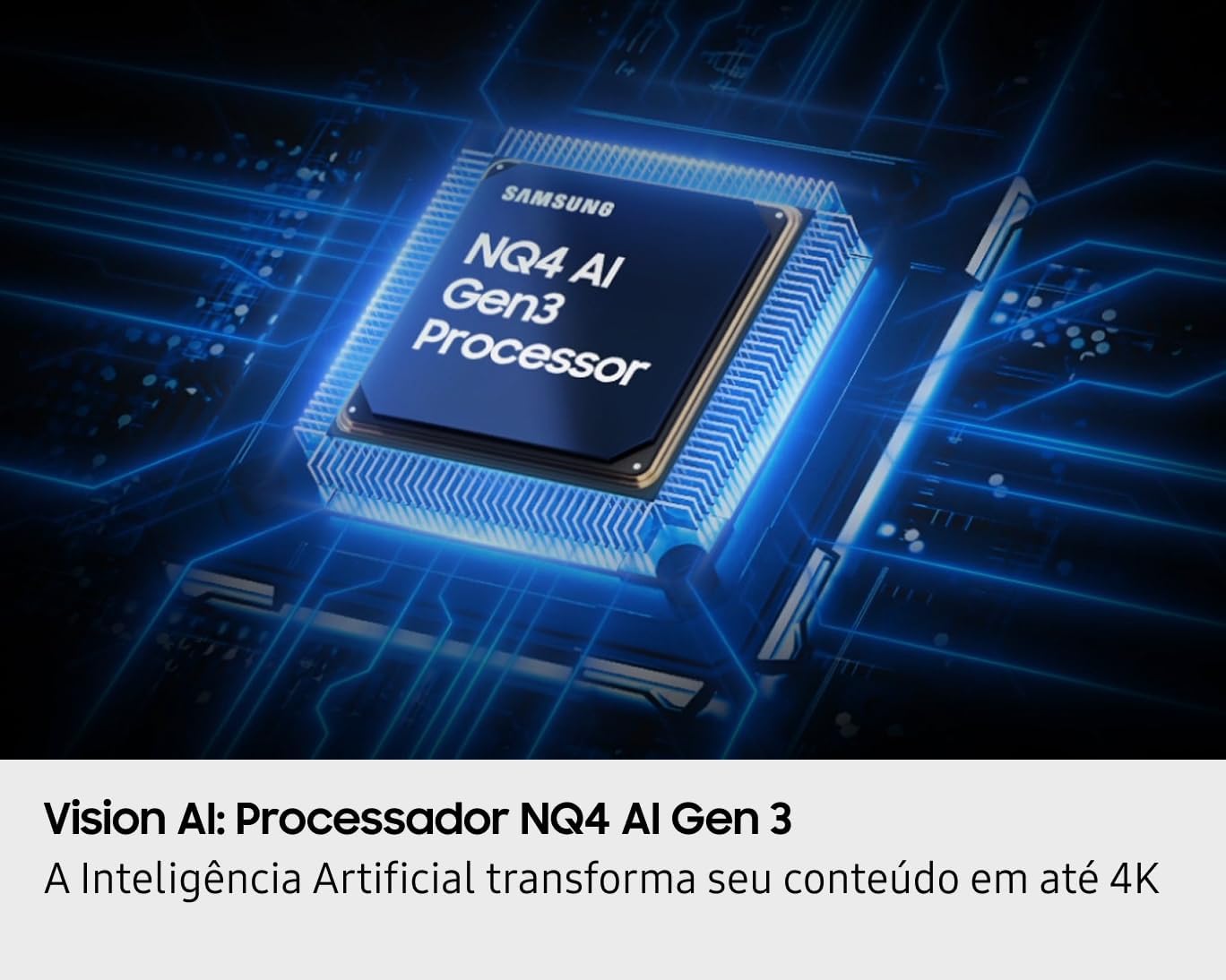 Cenas rápidas com fluidez de movimento. Vision AI: Aprimoramento de Movimento com AI. Através do processador Samsung com AI, a exibição é precisa de movimentos, sem deixar rastros ou borrões na imagem, tudo com a mais absoluta fluidez.