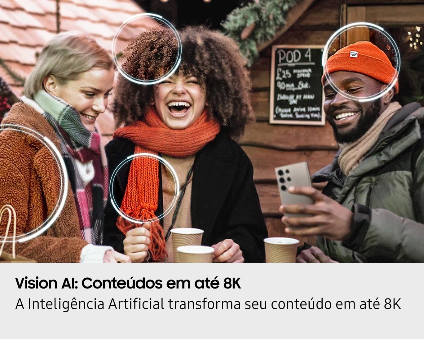 A Inteligência Artificial transforma seu conteúdo em até 8K. Vision AI: Imagens em até 8K. O Processador NQ8 AI Gen 2 e suas 256 redes neurais de Inteligência Artificial reúnem suas milhares de referências de imagens para recriar em até 8K as cenas de um conteúdo assistido em resolução inferior. Você desfruta sempre de uma excelente qualidade de imagem, independente da resolução original do conteúdo. *Essa otimização é chamada de ‘upscaling’.