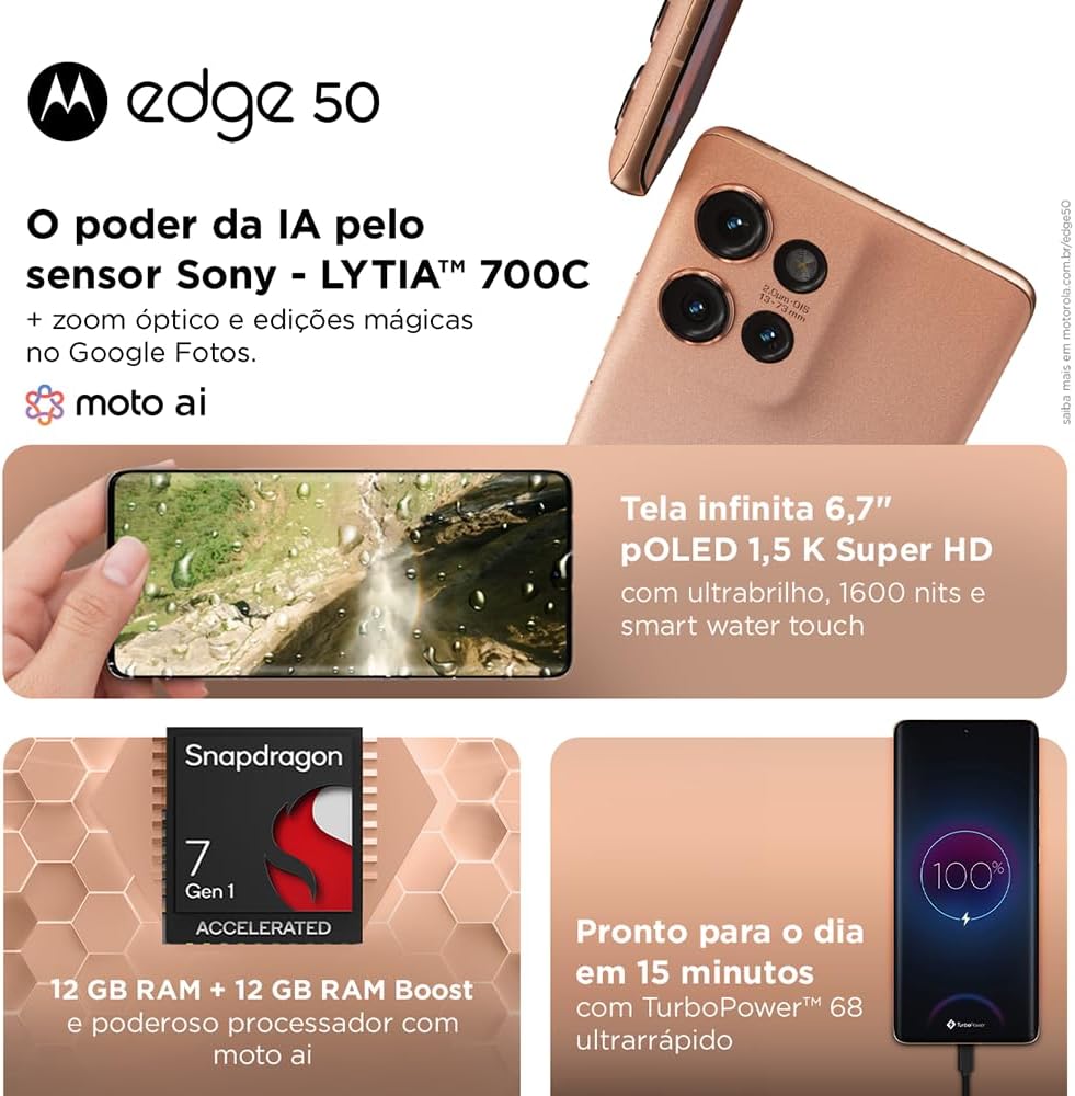 Smartphone Motorola Edge 50 5g – 512gb 24gb (12gb Ram+12gb Ram Boost) 50mp Sony Camera Moto Ai Ultrarresistencia Militar | Memória RAM: 12 GB ( + 12 RAM Boost) | Dispositivo desbloqueado para que você escolha a companhia telefônica de sua preferência | Compatível com redes 5G | Tela HDR10+ | pOLED | 120 Hz de 6.7″ | Tem 3 câmeras traseiras de 50MP/ 13MP/ 10MP OIS e Câmera frontal de 32Mpx | Processador Snapdragon7 Gen1 Accelerated Octa-Core de 2.5GHz com 12GB de RAM | Memória interna de 512GB | Com reconhecimento facial e sensor de impressão digital | Resistente a poeira, água e as quedas | O Smartphone mais fino do mundo com IP68 e resistência militar MIL STD 810H | O poder da AI pelas lentes Sony – LYTIATM 700C, zoom óptico e edições mágicas no Google Fotos | Poderoso processador Snapdragon® com moto AI e 24 GB (12 GB RAM + 12 GB RAM Boost) para múltiplas tarefas | Tela infinita 6,7″ pOLED 1,5K SuperHD com maior brilho do segmento e Smart Water Touch | Bateria de 5000 mAh, fique pronto para o dia com 15 minutos de carga no Carregador Motorola TurboPowerTM 68 ultrarrápido. Memória RAM: 12 GB ( + 12 RAM Boost) Dispositivo desbloqueado para que você escolha a companhia telefônica de sua preferência. Compatível com redes 5G. Tela HDR10+ | pOLED | 120 Hz de 6.7″. Tem 3 câmeras traseiras de 50MP/ 13MP/ 10MP OIS. Câmera frontal de 32Mpx. Processador Snapdragon7 Gen1 Accelerated Octa-Core de 2.5GHz com 12GB de RAM. Bateria de 5000 mAh. Memória interna de 512GB. Resistente à água. Com reconhecimento facial e sensor de impressão digital. Resistente a poeira e as quedas.