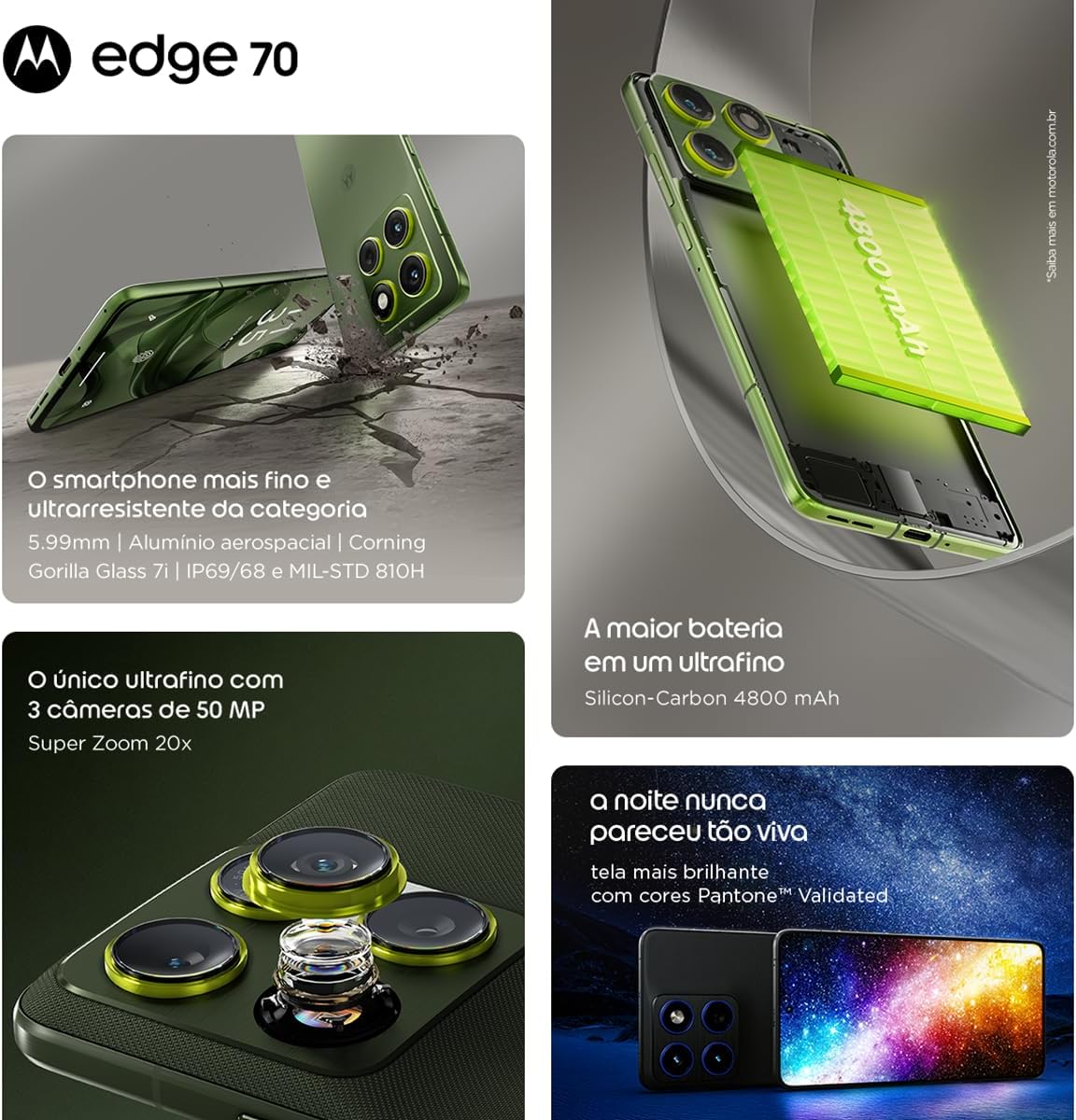 O smartphone mais fino e ultrarresistente da categoria* O único ultrafino com 3 câmeras de 50 MP* A maior bateria em um ultrafino* Tela Extreme AMOLED mais brilhante com cores Pantone Validated* Desempenho potente em um design ultrafino