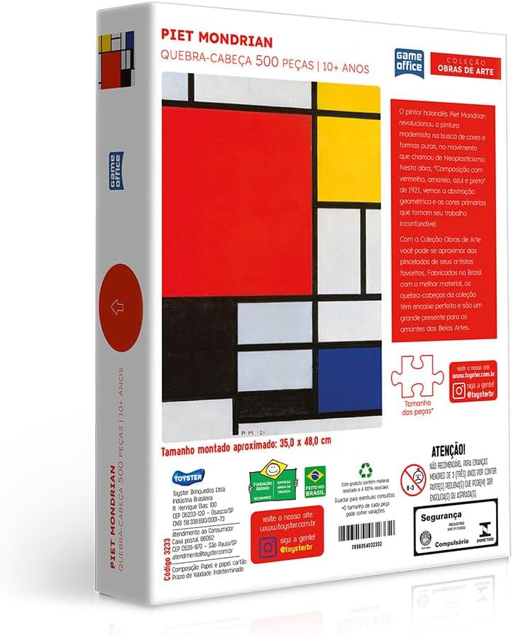 Aproxime-se das cores de Piet Mondrian com esse quebra-cabeça de 500 peças da Coleção Obras de Arte! Temos um padrão internacional de qualidade e encaixe suave que pode ser sentido em cada peça!