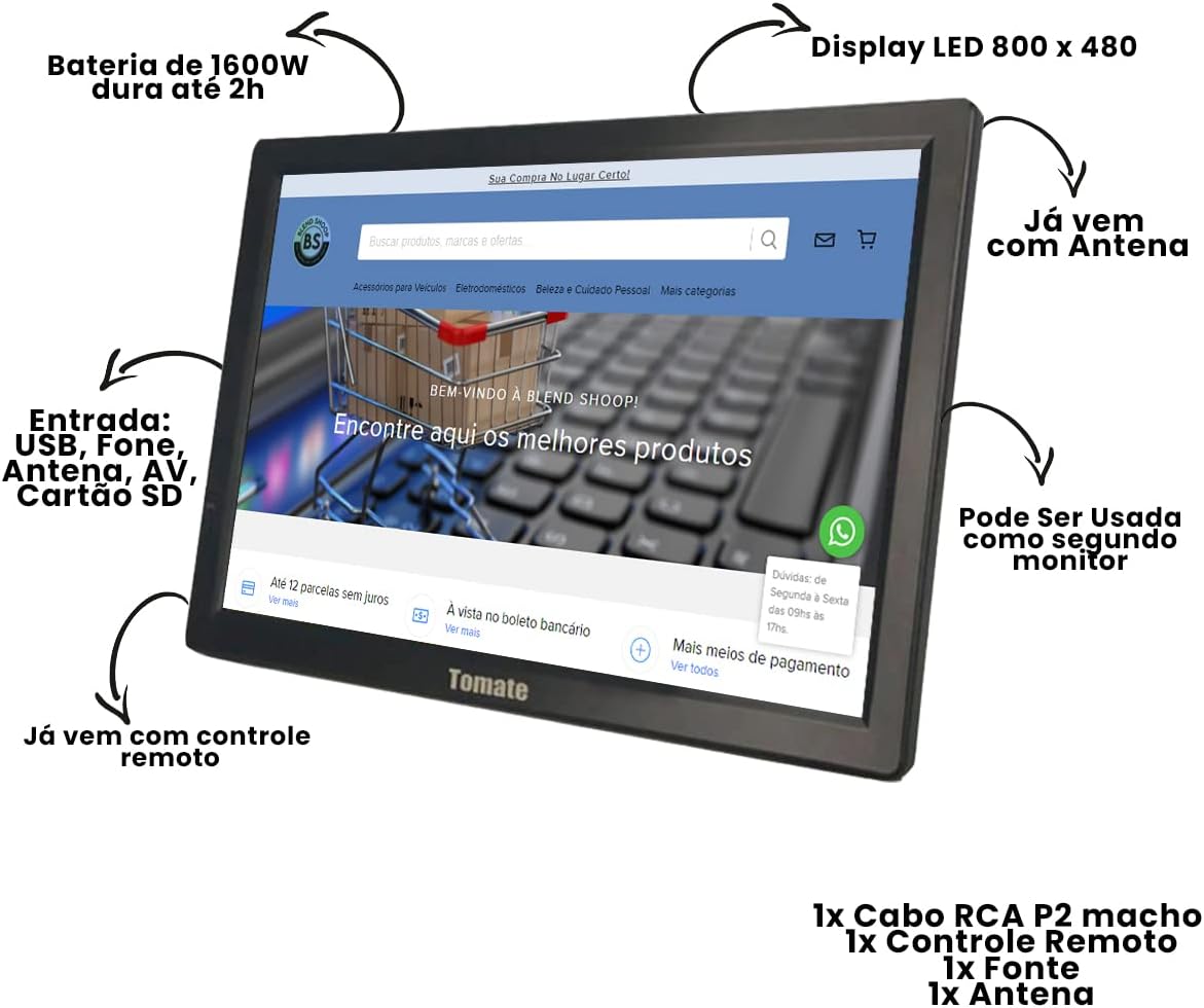 Tv 14 Portátil Led 12v USB Tomate Onibus Carro Van Caminhao MTM-1410 Tv Digital Portátil Led Monitor Hd 14 polegadas 12v com HDMI Usb Sd e AV modelo Tomate MTM-1014 COM HDMI Agora você pode levar sua televisão para onde for, para deixar na cozinha, na sala, em qualquer ambiente, viagens e muito outros locais!!! com a Tv portátil Tomate, de 14 polegadas de tela, você tem total flexibilidade para ter a comodidade de um televisor por onde for!!! Dimensoes e peso – largura 35cm altura 23cm profundidade 3cm peso 394g CARACTERÍSTICAS: TELA: 14” DISPLAY LED Colorido ISDB-T SEG DIGITAL TV 2 AUTOFALANTES DE 2W BATERIA DE LITHIUM RECARREGÁVEL BATERIA DE 1200MAP PARA USO EXTERNO ENTRADA USB (PARA LIGAÇÃO DE GOOGLE CRHOME CAST) ENTRADA MICRO SD CARD ENTRADA HDMI Consumo de energia <24W SUPORTA MIDIAS: DIVX, AVI, VOB, MEG-4, MKV, WMA, MP3, JPG, PNG, BMP CONECTOR DE FONE DE OUVIDOS TENSÃO AV 100-240V ~ 50/60HZ SAÍDA DC 12V / 1.5A DTV SUPORTA HDTV COM GRAVAÇÃO DE PROGRAMAS PARA USB OU DISCO RÍGIDO (PVR) Conteúdo da Embalagem 1x Monitor LCD 14" Led TFT 1x Cabo 3RCA x P2 1x Manual (Idioma Se Encontra Em Português) 1x Controle Remoto 1x Fonte de Alimentação Garantia 12 meses ! (conforme instruções da caixa/embalagem)
